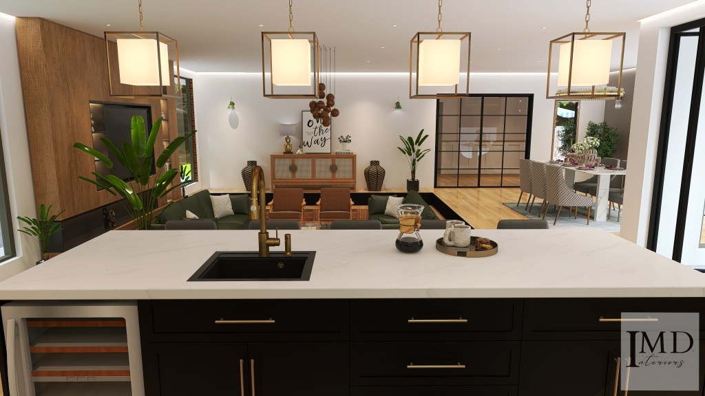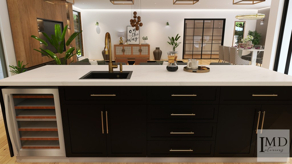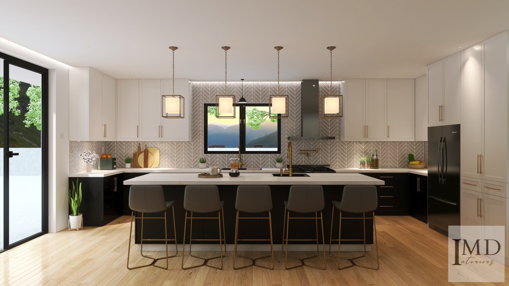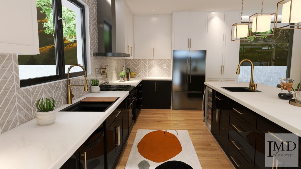 Black and White Kitchen Area: 295.65 sq. ft. Interior Design style: Contemporary Kitchen Type/Shape: U-shape with Large Kitchen Island Design Brief: A large, open, well-lit, chic kitchen design with ample storage and a layout that allows for easy movement, facilitating smooth workflow.